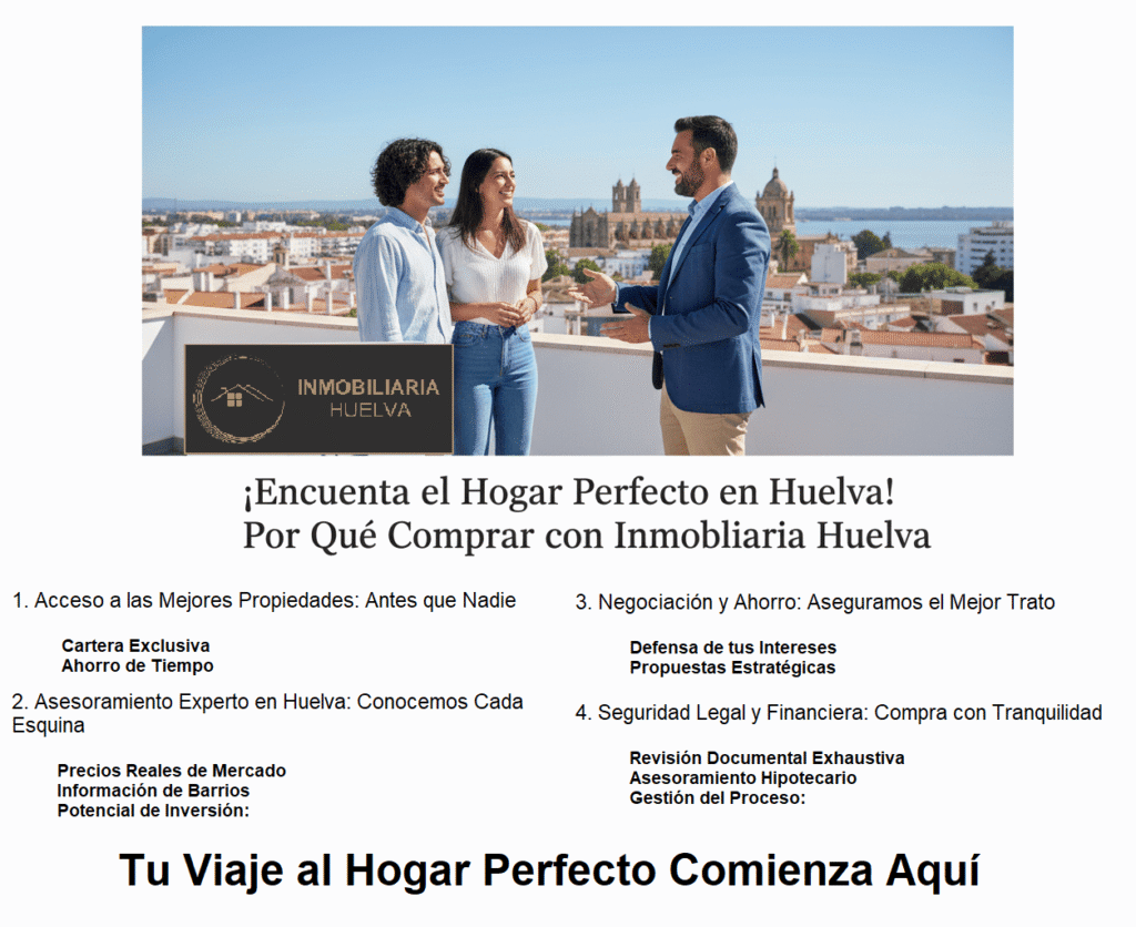 Comprar una vivienda en Huelva con Inmobiliaria Huelva significa tener un equipo de profesionales dedicados a proteger tu inversión y simplificar tu vida. Dejanos el trabajo duro a nosotros. Contáctanos hoy y permítenos ayudarte a dar el paso más importante: Encontrar la llave de tu nuevo hogar en Huelva.